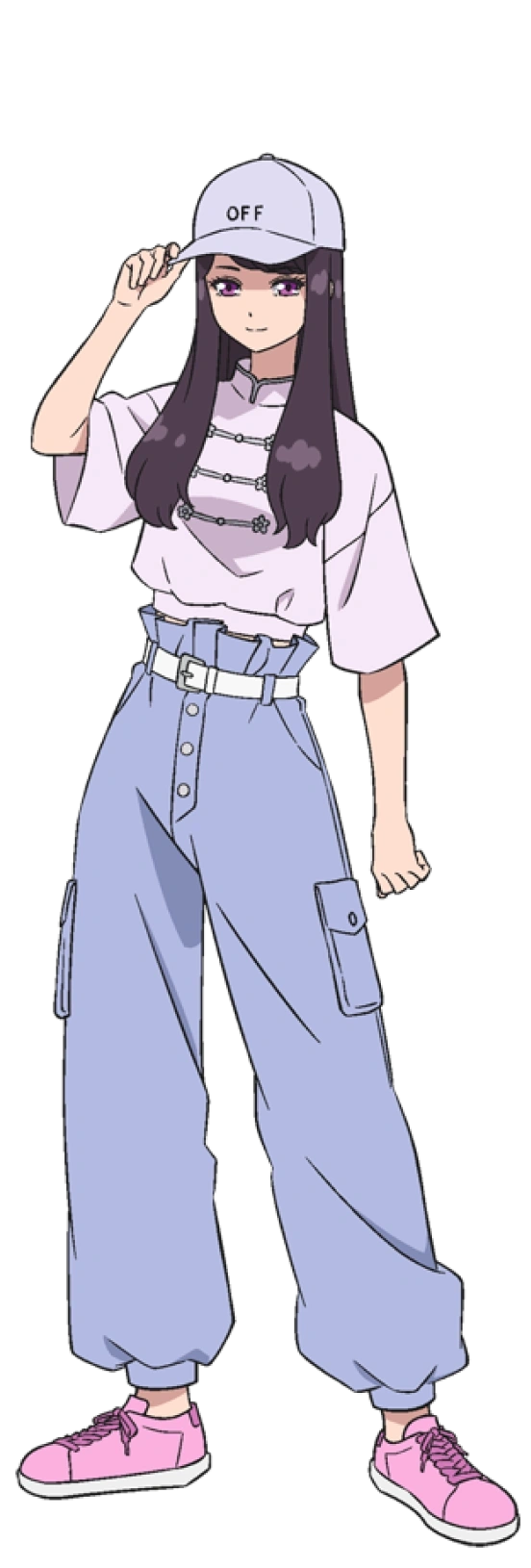 However while dancing, she is usually seen wearing pastel pink Chinese-style Tang suit top, pastel blue paperbag joggers, white belt, pink shoes and a pastel purple cap that spells "OFF".